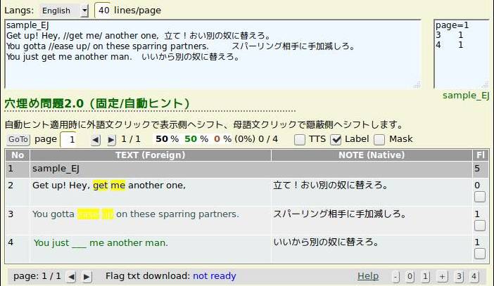 入力領域左は本文・対訳データ、同じく右は実績データ(行番号と習得フラグの対)。